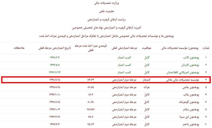 ملالۍ د لوړو زده کړو مؤسسې د تضمین کیفیت او اعتبار ورکوني دوهمه مرحله د ۸۴.۶۲ نمرو په ترلاسه کولو سره پّه بریالیتوب سره پاس کړي.